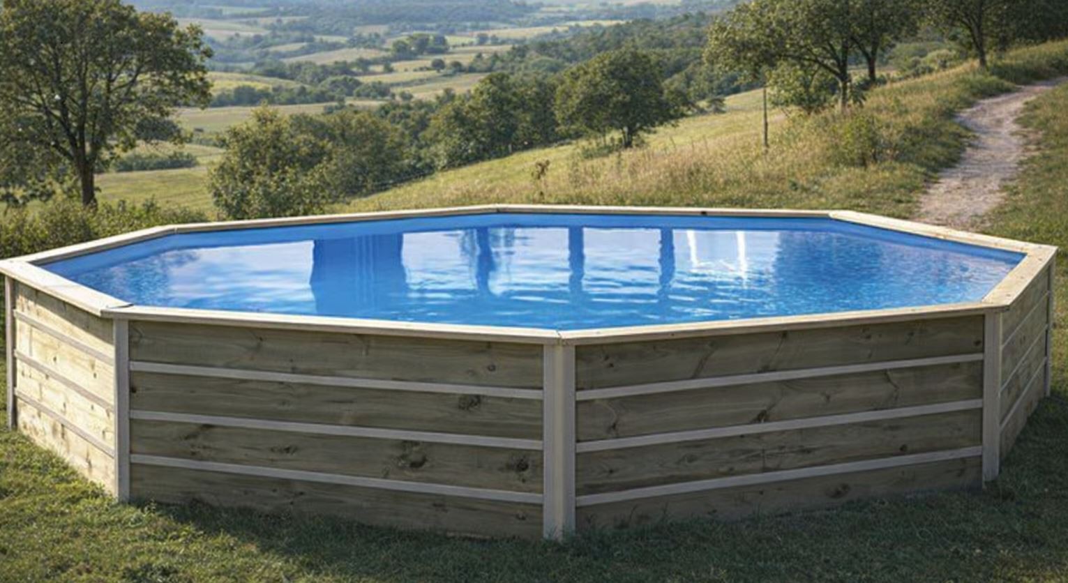 Piscine octogonale longitudinale innovante en bois traitée au Tanalith pour un usage familiale en plein air !